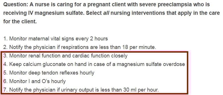 “Notify the physician if urinary output is less than 30 ml per hour” - The medication will be eliminated through the kidneys. If the client’s urinary output is less than 30 ml per hour, then they are at risk or already have magnesium sulfate toxicity. A physician can assess the patient and determine the best course of action to try to correct the issue.
