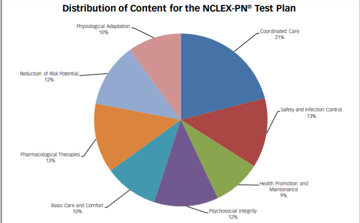 On the PN test, the coordinated care and safety/infection control make up the "safe and effective care category" which is 34% or about 1/3 of the test. The pharmacology and physiology sections make up a slightly smaller chunk of the test as compared to the RN NCLEX at 23% vs 29%. There is more emphasis given to "basic care and comfort" on the PN test at 10% similar to the 9% on the RN examination. Psychosocial integrity, reduction of risk, and health promotion combine to form the rest. So if you are taking the PN test, you need to spend quality time emphasizing pharmacology, physiology, basic care and comfort, and safe care of patients in your studying. However, don't neglect reduction of risk, psychosocial integrity, and health promotion all together or you will not do well.